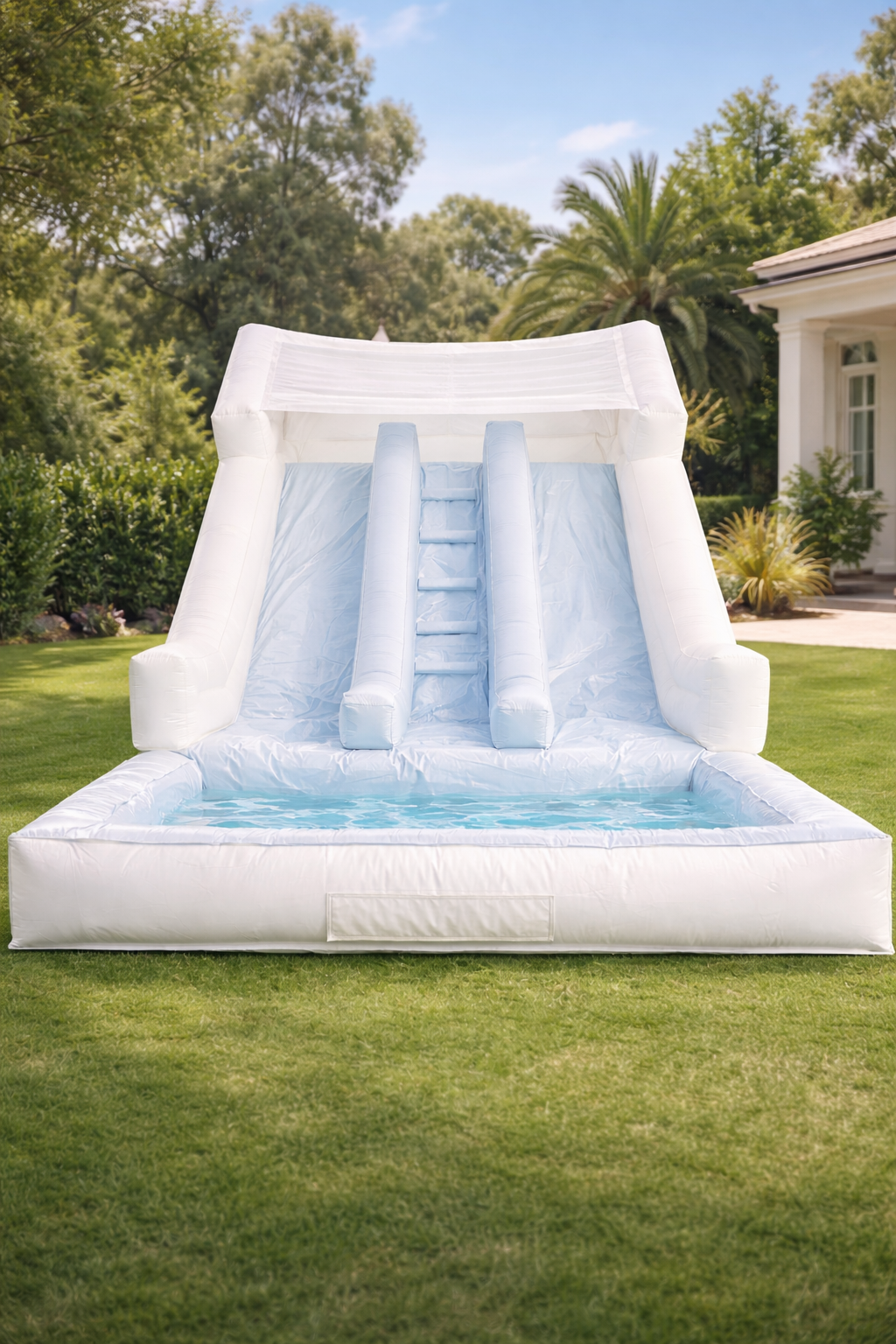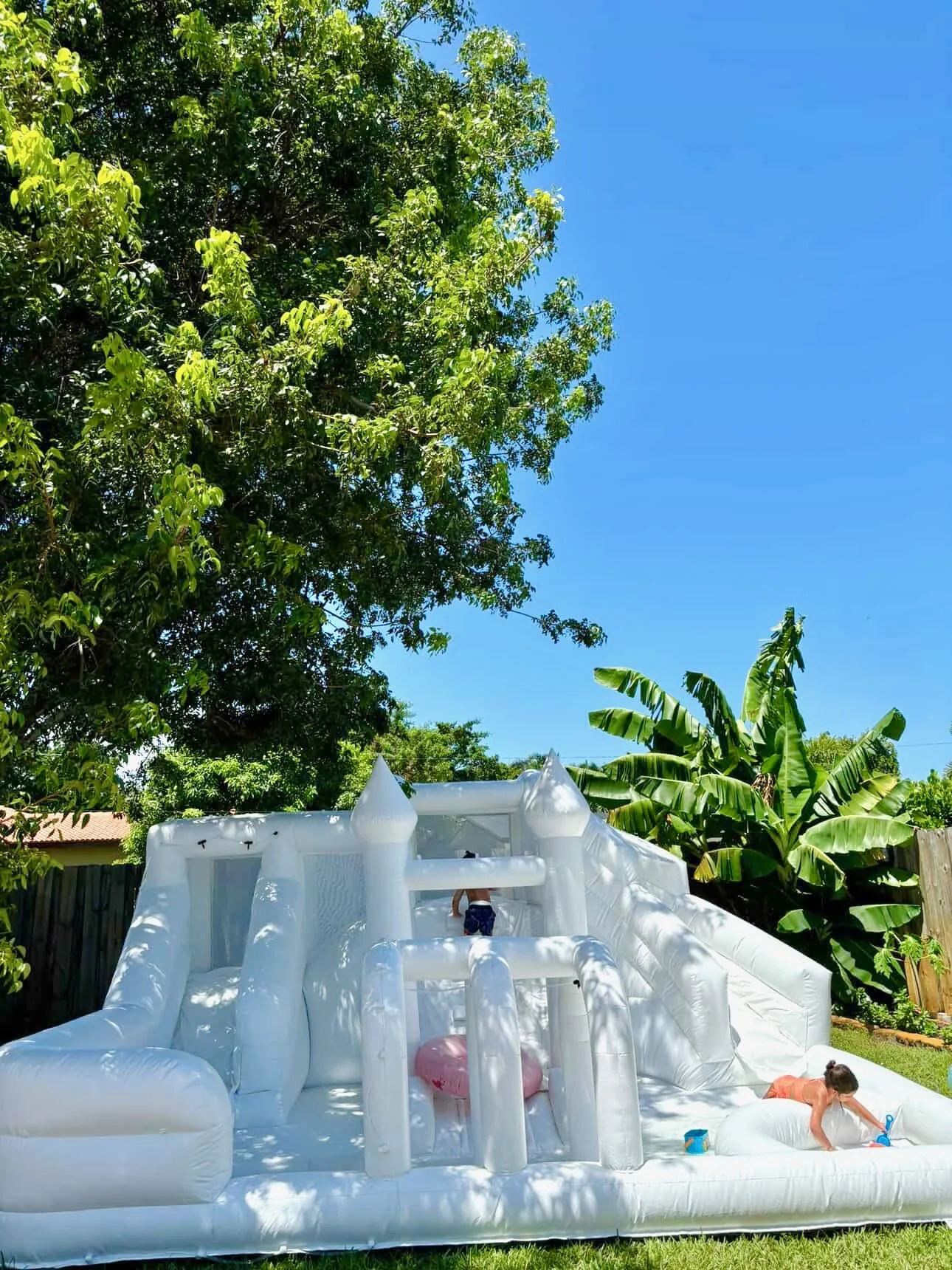 Our stunning all-white inflatable splash pad is the perfect summer addition for birthday parties, backyard gatherings, or family events. With a built-in climbing section, wide double slide, and shallow splash zone, it's designed for safe water play and endless fun for toddlers and young kids.